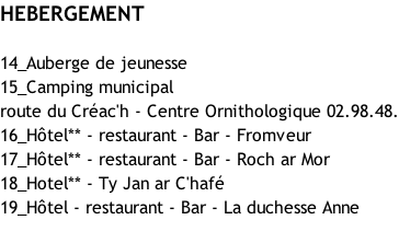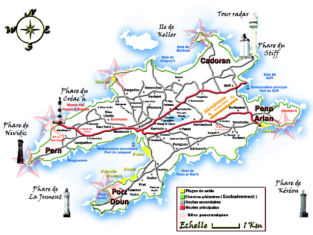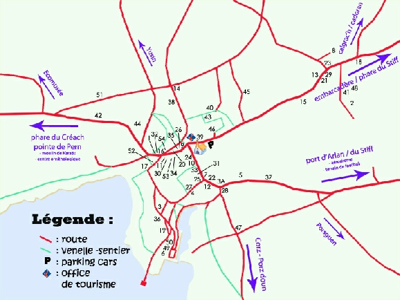 SANTE SECOURS  1_Cabinet infirmier - Dentiste  2_Caserne de pompiers  3_Gendarmerie  4_Médecin-Kiné.  5_Pharmacie 6_S.N.S.M. ALIMENTATIONS   7_8 à huit  8_Marché des îles 9_Spar marché 10_Boulangerie 11_Viennoiserie 12_Boucherie 13_Salon de thé RESTAURATION  20_Bar - restaurant - Ty Korn  route du Stiff - Bar - restaurant - Resto du Stiff  route du Stiff - Bar - Crêperie de l'arrivée 21_Crêperie du Stang . 22_Crêperie Ti a Dreuz . 23_Ty Bihan restauration rapide PRESSE / SOUVENIRS  24_Bar - Tabac - P.M.U. - Loto  25_Maison de la Presse  26_Abri du mouton 27_Art Keo 02.98.48. 28_Avimer – crédit maritime 29_Brocante  30_Les 4 saisons 31_Mary's Jo couture  32_Ouessantine productions (accès internet) SERVICES  33_La Poste  34_Credit mutuel C.M.B.  35_Crédit agricole  36_Mairie  nota : des distributeurs d'argent sont présents  dans les alimentations Spar et 8 à huit AUTRES COMMERCES  3A_Sympatifs 37_Electricité - Pulsat . 38_Garage Kérébel LOCATIONS DE VELOS  52_Cyclévasion, Locacycles Savine 53_La Bicyclette 54_OuessantCycles Avec l'aimable autorisation de l'office du tourisme  de Ouessant  (visite indispensable ) Télécharger le plan de Ouessant Télécharger le plan de Lampaul
