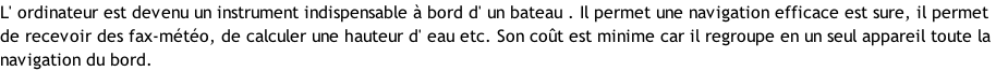 Gps Radio Loch sondeur Instructions nautiques Internet Gps Cartes Logiciel de navigation Logiciel de météo Logiciel de marée Wifi Deux plaquettes météo France utiles : Plaquette météo France 1  Plaquette météo France 2
