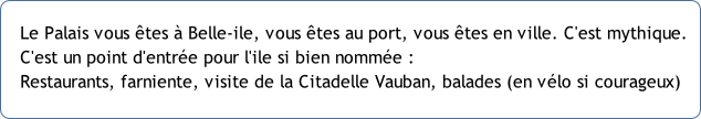http://www.belle-ile.com/fr/ http://alain.gosse.free.fr Port de Le Palais Marée Bassin de  La Saline Eau électricité Pont de  L'hôpital 0h30<PM>0h30 Bassin à flot Porte-écluse 1h30<PM>1h Carburant eau Mie-marée Capitainerie Embossage  Grands navires Embossage  Petits navires